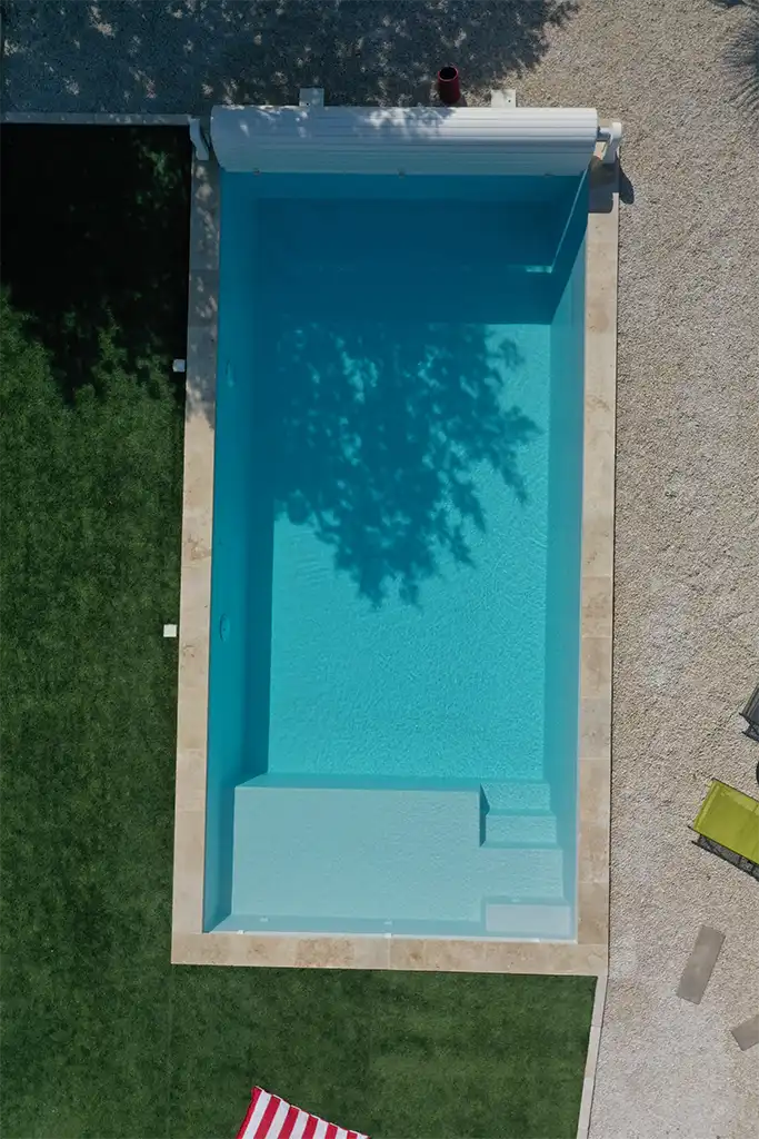 Doté d’un escalier minimaliste de 4 marches positionné dans l’angle de la piscine et sur le côté de la plage immergée, notre conception permet une optimisation de la taille de la piscine, tout en préservant un espace de baignade des plus agréables.